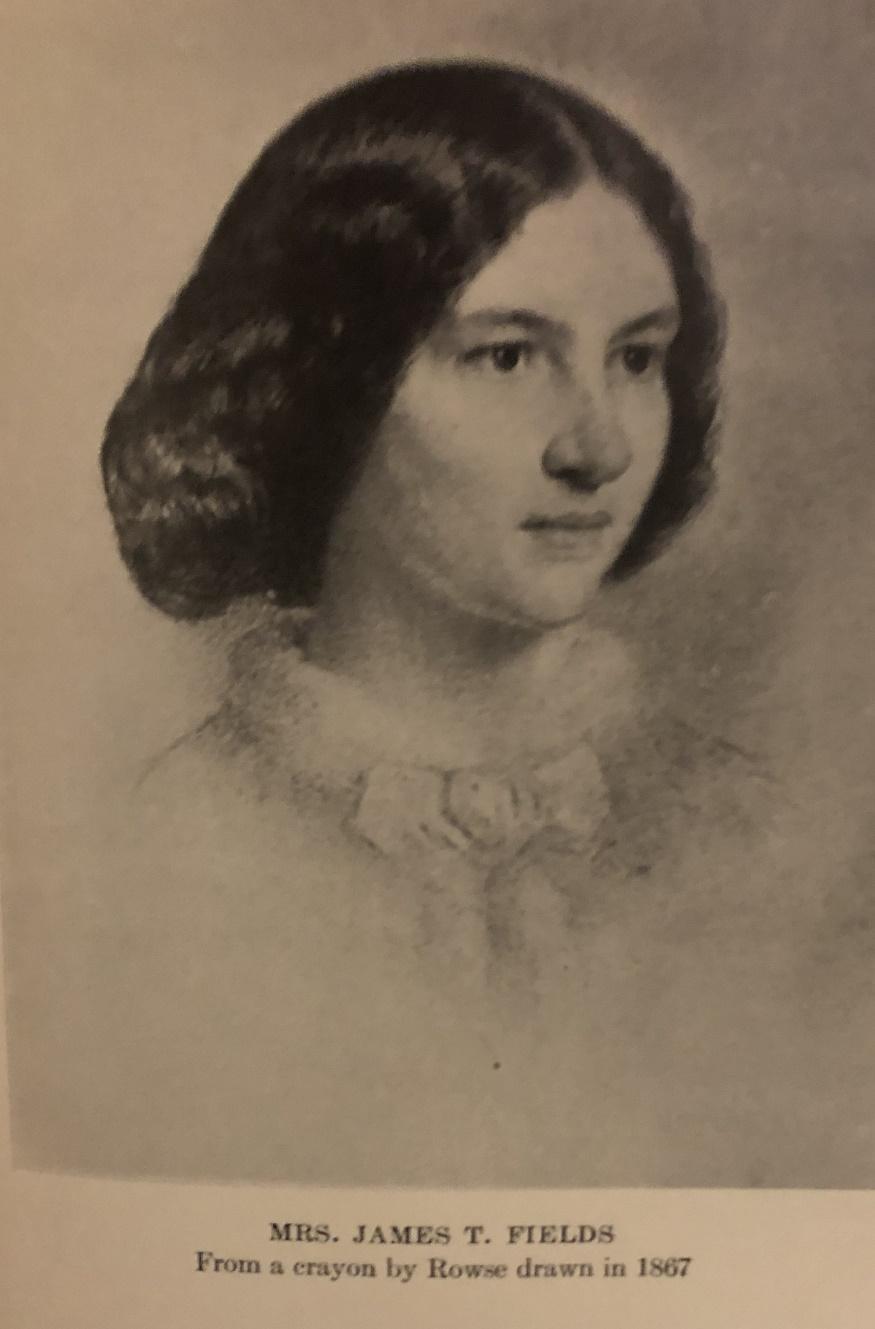 When we got here, we found that Mrs. Fields had not only garnished the rooms with flowers, but also with holly (with real red berries) and festoons of moss dependent from the looking glasses and the picture frames. She is one of the dearest little women in the world. The homely Christmas look of the place quite affected us.